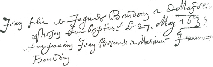 Remarques : Trois frères et une soeur sont baptisés à Courcival (St-Brice) : Nicolas, le 14-04-1629 ; Étienne, le 23-07-1632 ; Madeleine (pionnière), le 12-01-1639 et René (pionnier).