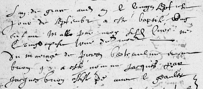 Remarques : Les actes suivants sont au village de Saint-Benin rattaché à Thury-Harcourt en 1858. Jacques y est né et baptisé, ainsi que sa soeur Françoise, le 26-12-1630. Sa soeur Anne Bertheaume, mariée le 25-02-1650 avec Gilles Taillebosc (Jean et Tassine Friley), né à Saint-Martin-de-Sallen (14628). En 1625, son père est nommé Pierre Berthaume (ses parents sont omis) ; et son grand-père maternel est feu Laurent Brion. Sa mère est nommée Anne Biron à son baptême.