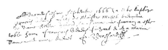 Remarques : François Bienvenu, engageur de voyageurs et cabaretier, se marie 2 fois : m-1 Détroit (Ste-Anne), avec Geneviève Charron/Laferrière (Jean et Anne d'Anneville); m-2 avec Marie-Anne Lemoyne (Nicolas et Marguerite Jasselin). Deux frères et une soeur sont baptisés à St-Pierre-le-Vieux (St-Pierre): Jean/Sauveur, 00-01-1661, huissier célibataire s. 07-01-1722 à Fontenay-le-Comte (N-D) (85092); Catherine/Perrine, 19-08-1663 et François-Vincent (jumeau), 19-09-1666. Les actes suivants sont à Maillezais (St-Nicolas) (85133). Sa mère Hélène Guyard/Guiard, veuve, s. 09-11-1677. Ses grands-parents paternels sont Michel Bienvenu, maître, notaire né 1573, s. à 80 ans le 29-09-1653, et Marie Boutinard, née 1583, s. à 60 ans le 24-11-1643, dont 5 enfants b/s : Michel-1, 20-08-1616, s. 16-90-1616; Gervais, 19-06-1618; Catharine, 31-07-1619; Michel-2 (père du pionnier), 23-09-1621 et François, 23-03-1624.