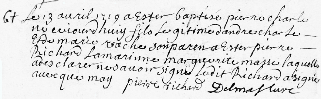 Remarques : Les actes suivant sont à Dolus-d'Oléron (St-André). Ses frères et soeurs sont n/b. : Marie, 23-05-1704 ; Pierre-1, 03-01-1706 ; Marguerite, 03-10-1707, d/s 21-07-1710 ; André, 14-07-1709 ; Étienne, 14-04-1712 ; Charles-Augustin, 29-01-1714 ; Angélique, 04-07-1715, d/s 19-02-1722 et Jean, 13-07-1721, d/s 28-08-1722. Son père André Charles, marié sous Charlet, n/b 19-01-1682, d/s 29-01-1749. Sa mère, n/b 16-06-1691 lieu-dit : Le Bourg, d/s 11-11-1749. Le mariage de ses parents est non filiatif ; la date de leur naissance est inscrite sur leur acte de décès.