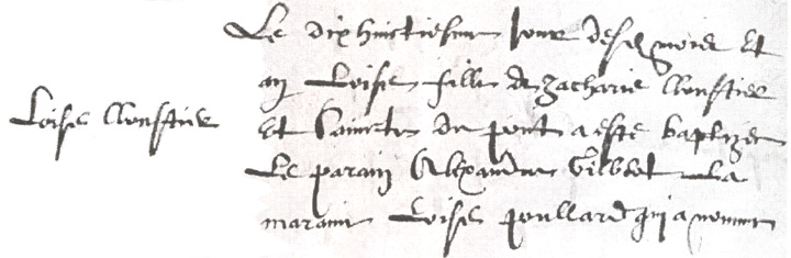 Remarques : Les actes de ses frères et soeurs sont à Mortagne-au-Perche (St-Jean) : Zacharie, b. 16-08-1617 ; Jean, b. 13-05-1620 ; Sainte, b. 01-11-1622, inh. 19-09-1632 ; Anne, b. 19-01-1626 ; Charles, b. 03-05-1629. Elle est arrivée au pays, avec sa mère sa soeur et ses deux frères Charles et Jean, en 1635 ou 1636.