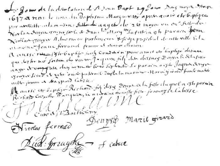 Remarques : Il fut administrateur, colonisateur, négociant et entrepreneur en pêcheries. d. lors du naufrage du St-François-Xavier. De son m-1, 2 enfants: Marie-Anne, b. 25-05-1681 à Jemseg (Acadie) et Nicolas, né 1682. Ses frères et soeurs sont b. à La Rochelle (St-Barthélémy) : Nicolas, b. 14-09-1644 ; Marguerite, née 00-06-1645, b. 29-08-1647, inh. 04-01-1654; Jacques-1, né 10-09-1646, b. 29-08-1647 ; Charles, b. 13-09-1648; Jacques-2, b. 17-12-1650. Son père est pionnier, fiche 241225.
