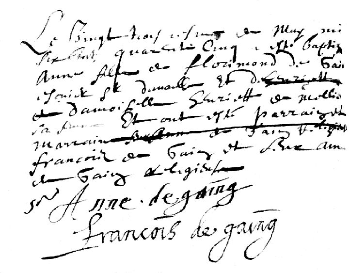 Remarques : En 1669, sa mère est nommée Henriette Fermilis. Sept frères et soeurs sont baptisés à Usseau (St-Hilaire) : Florimond, le 02-12-1642 (contrat de mariage à Paris, le 17 novembre 1670, not. Raymond) ; Henriette, le 29-06-1646 ; Louis, le 05-08-1647 ; Jean, le 21-06-1649 ; Louise, le 16-08-1649 ; Charles, le 04-05-1651 et François, le 09-04-1654. Henri, leur frère, Sieur du Moulin et des Coutardières, né en 1653, est décédé à Usseau le 10-02-1671. Ses grands-parents paternels sont René de Gaing, écuyer Seigneur d'Availle, et Judith Dubec, de la Motte d'Usseau. Ses grands-parents maternels se nommaient Maurice De Mellis, valet de chambre du comte de Moret à St-Germain-en-Laye (1611), et Michelle Poilleux. Son père avait épousé en 1ere noce Marie Jalès de qui il avait eu René, Renée-Louise et Gabrielle.