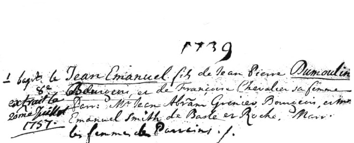 Remarques : Il s'établit à Cohakia (Illinois) en 1783 où il décède en 1805. Son frère François-Luc est baptisé le 01-06-1742 à Vevey (Église réformée). Son père est né à Vevey en août 1696. Ses grands-parents paternels sont Aimé-Paul Dumoulin et Jeanne Heg. Son grand-père maternel est Jacques-Sigisimond-Albert Chevalier.
