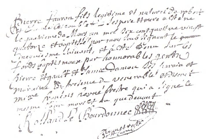 Remarques : Deux frères sont nés et baptisés à St-Carné (St-Pierre) : Jean, 03-03-1699 et Julien, 23-07-1700. Sa mère est nommée Jeanne Goblet, en 1735.