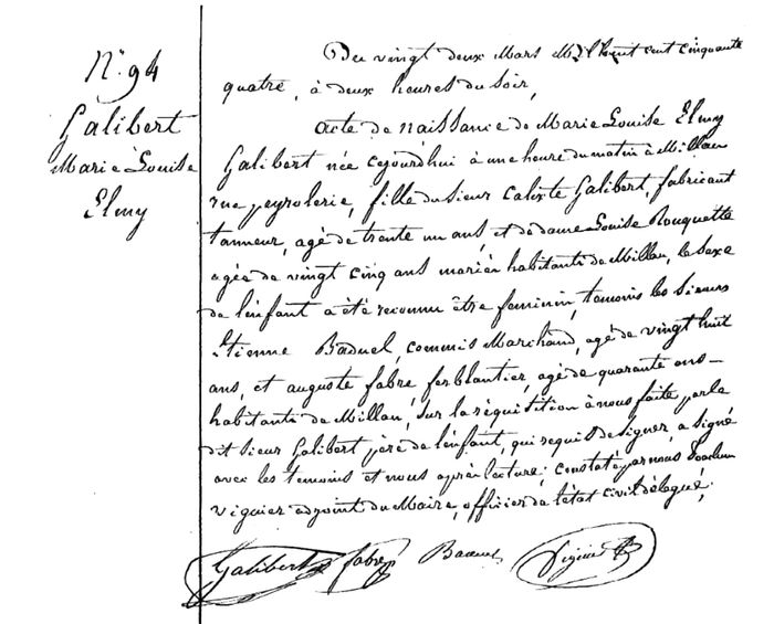 Remarques : Elle est née à Millau, Aveyron, à moins de 7 km d'Aguessac. Son père Jean-Étienne-Calixte est né à Aguessac (L'Assomption), le 01-05-1822. Sa mère Marie-Louise est née à Cornus, le 16-09-1828. Ses grands-parents paternels sont Jean Galibert et Marguerite Rascalou, mariés à Aguessac (L'Assomption), le 28-04-1807. Ses grands-parents maternels sont Jean-Baptiste Rouquette et Marianne Azémar, mariés à Cornus, le 29-12-1819.