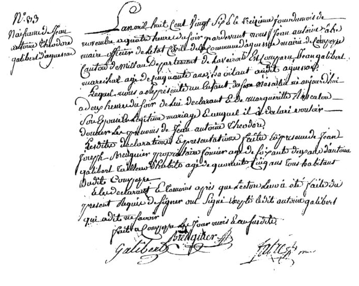 Remarques : Les actes suivants sont à Aguessac (L'Assomption), duplicata à Compeyre (St-Vincent) (17070). Ses frères et soeurs sont b. : Jean-Mathieu-Calixte, 24-02-1808 Jean-Casimir-Honoré, 16-05-1809; Marguerite-Victoire (1), 10-09-1810 Jean-Albert-Nérée, 11-05-1812; Jean-Antoine-Laudrin, 10-06-1813; Marguerite-Rosalie, 31-07-1815; Marie-Eulalie, 28-03-1817; Jean-Pierre-Albert, 09-02-1819; Marguerite-Victoire (2), 19-10-1820; Jean-Étienne-Calixte (pionnier), 01-05-1822; Jean-Joseph-Théodore, 14-11-1823; Pierre-Casimir-Honoré (pionnier), 28-06-1825. Ses grands-parents paternels sont Jean Galibert (Jean, maître maréchal et Marie Granier, m. 26-11-1732 à Compeyre)), serrurier, maréchal-ferrant né 09-01-1744 à Aguessac, d. 21-03-1814 à Aguessac, et Marianne Granier (fille de Jean), d. 03-12-1812 à Aguessac, mariés à Compeyre, le 27-11-1771, dont un fils Jean (père du pionnier), né 18-05-1776 Aguessac, d. 29-11-1852 Aguessac. Ses grands-parents maternels sont Jean Rascalou (fils de Raymond), bastier-1786, aubergiste-1787, ménager-1790, et Marguerite Alegre, d. 54 ans le 30-07-1813 Aguessac, dont 7 enfants sont b. à Aguessac : Marguerite (mère du pionnier), 23-03-1786; Jean-Antoine, 08-07-1787; Pierre-Victor, 28-02-1790; Victor, 09-08-1794; Alexandre, 03-02-1797; Marie-Rose, 24-06-1799 et Pierre-Auguste, 23-11-1800.