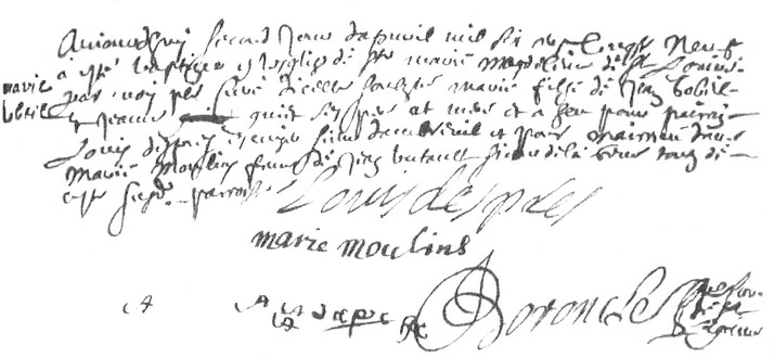 Remarques : Les actes suivants sont à St-Liguaire (Ste-Marie-Madeleine) (79266). Trois soeurs sont baptisées, puis pionnières: Marie-1, 25-01-1655, Françoise, 16-01-1656 et Jeanne/Jeanne-Angélique, née 1663 (3 ans en 1666). Ses grands-parents paternels sont Pierre Gobeil (f. Michel et Vincente Benoist), laboureur à charrue, et Catherine Chaignaud (Guillaume et Jeanne Andrée), mariés le 18-02-1623 à St-Liguaire (Ste-Marie-Madeleine). Ses grands-parents maternels sont Pierre Guiet et Gabrielle Roquier, mariés à Échiré (Notre-Dame), le 21-01-1632.