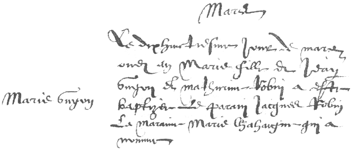 Remarques : Deux soeurs et deux frères sont baptisés à Mortagne-au-Perche (SJSM) : Barbe, le 19-04-1617 ; Jean, le 01-08-1619 ; Simon, le 02-09-1621 et Marie-2, le 29-01-1627. Trois frères sont baptisés à Mortagne-au-Perche (ND) : Claude, 22-04-1629 ; Denis, b. 30-06-1631 et Michel, b. 03-03-1634. Ses grands-parents paternels sont Jacques Guyon (Mathurin et Madeleine Aymard), arpenteur royal et Marie Huet, inhumée le 26-02-1626 (SJSM), mariés le 15-04-1583 (SJSM). Ses grands-parents maternels sont Eustache Robin et Mathurine Avrard.