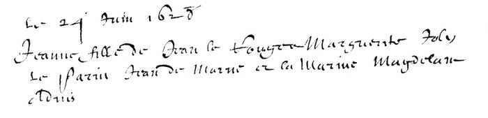 Remarques : Sept frères sont baptisés à Joinville (Notre-Dame) : Nicolas, 18-05-1604; Charles, 07-02-1607; Jean-1, 13-11-1608; Jean-2, 27-05-1612; Blaise, 00-07-1615; Pierre-1, 21-12-1618; et Pierre-2, 00-12-1620. En 1654, son père est prénommé Pierre. Elle épouse Louis Carreau dit Lafraîcheur fils de André Carreau et Jacquette Caussade, originaire de Bordeaux (Gironde).