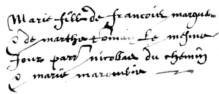Remarques : M. 2 vers 1652 à Trois-Rivières, avec Quentin Moral de St-Quentin. Sauf indication, les actes suivants sont à Rouen (St-Vincent). Son père François, b. 10-10-1582 à Rouen (St-Maclou). Sa mère Marthe Romain, b. 25-07-1589. Trois frères et une soeur : François-1, b. 30-03-1611; François-2 (pionnier), b. le 22-10-1612; Jean, b. 04-02-1616 et Catherine, b. 19-02-1617. Ses grands-parents paternels sont Thomas Marguerie et Marie Houllevicque. Son grand-père maternel est Nicolas Romain.