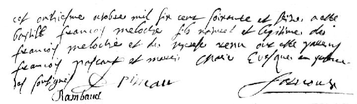 Remarques : En 1700, sa mère est nommée Marie Bloquin. Trois soeurs et un frère sont nés à Fontenay-l'Abbatu : Françoise, m. LR (St-Sauveur), le 06-02-1690 avec Alexis Brouard/Bronard (f. Louis, sergent royal et Michelle Millet), laboureur né à Marennes (17219); Louis, né 1680, d. 12, s. 13-06-1687 LR (N-D), 7 ans; Renée, m. LR (St-Nicolas), le 16-11-1701 avec Antoine Yverneau (vf de Rachel Bizière); Marie, m. LR (St-Barthélémy), le 15-07-1704, avec Jacques Bonnoteau (Louis, tailleur d'habits et Jeanne Bertin), journalier né à Luçon. Son père François Méloche (fils de François), marchand à Le Bourdet (79046), puis voiturier à Fontenay-l'Abbatu, s.14-05-1696; veuf m-1 de Marie Péloquin, dont Marie, née 1657, 6 ans en 1663. Ses grands-parents maternels sont Massé Hernu, roulier rés. à LR, et Mathurine Mallet. Ses arrière-gp maternels sont Michel Hernu, marchand à Tourville.., Normandie, et Anne Hay; veuf m-2 avec Judith Borg.