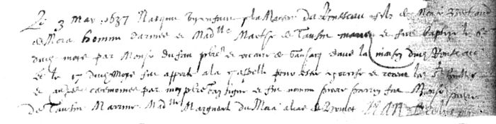 Remarques : Ses grands-parents maternels étaient Jean de Tauzin, sieur de Bonnehé d. 10-10-1626, et Mademoiselle Marsan.