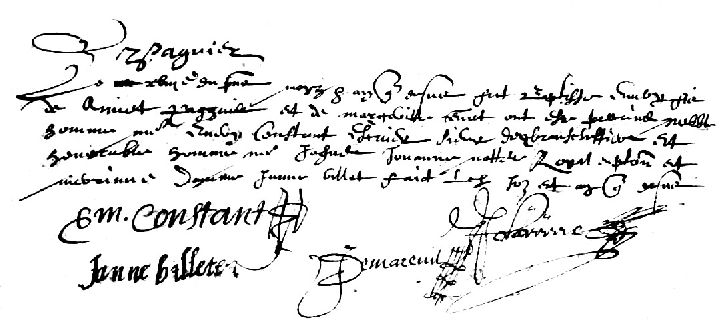 Remarques : Quatre enfants sont baptisés à Poitiers (St-Hilaire-de-la-Celle) : Maurice (pionnier), 20-12-1641 ; Pierre, 22-08-1638 ; Marie, 02-01-1640 et Louis, 03-07-1643. Trois enfants sont baptisés à Poitiers (St-Paul) : Marguerite (pionnière), 07-04-1645 ; François, 12-01-1647 et René (pionnier), 07-08-1650. Devenu veuf, Emery Pasquier passe un cm du 27-09-1659 greffe Berthonneau à Poitiers, avec Renée Guillocheau (parents omis), veuve de Jacques Forget.