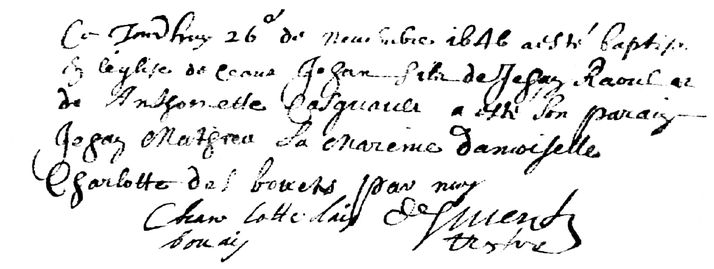 Remarques : Il est baptisé Jehan Raoul (Jehan et Antoinette Casgault). En 1682, ses parents sont nommés Samuel Roux et Antoinette Château. Les actes suivants sont à Fontaine-Chalendray (St-Maximien). Deux frères et deux soeurs sont n/b sous Raoul : Louis (mère Toinette Guanault), 23-05-1649; Tiphaine (mère Tonette Cacault), 15-02-1651; Abel, 30-08-1652 et Françoise (Toinette Guagnault), 19-08-1655. Sa mère, b. 27-10-1624, d/s 03-06-1691. Son père, d/s 08-02-1693. Ses grands-parents paternels sont Jean Raoul, marchand et Marthe Belamy. Ses grands-parents maternels sont Jacques Cascault et Nicole Tesseau