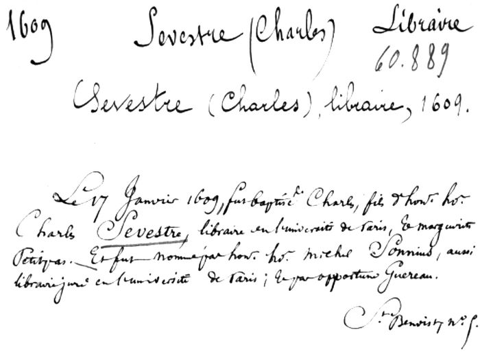 Remarques : Six frères sont baptisés à Paris : Charles (homonyme) (St-Benoit), le 28-12-1607 ; Thomas (St-Benoit), le 04-05-1611 ; Jacques (St-Étienne-du-Mont), le 26-04-1614 ; Étienne (St-Étienne-du-Mont), le 17-08-1617 ; Nicolas (St-Barthélémy) le 01-08-1620 et Antoine (St-André-des-Arts) le 20-11-1622. Ses grands-parents paternels sont Thomas Sevestre, libraire et Jeanne Boucherot. Ses grands-parents maternels sont Jean Petitpas, marchand de vins et Marguerite Macé.